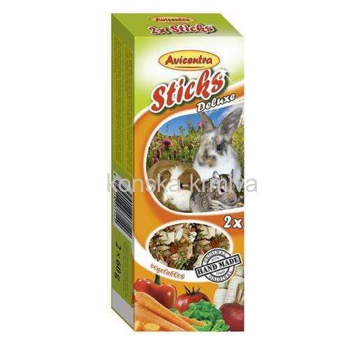 Tyčinky se zeleninou 2 kusy v balení jsou doplňkové krmivo pro králíky, morčata a další hlodavce. Jedná se o pochoutku, ale také krmivo, které Vašemu mazlíčkovi dodává důležité vitamíny a minerály pro zdravý a vitální život. Forma Sticksu zaručuje dělší zábavu pro vašeho miláčka, než mňamka v misce.