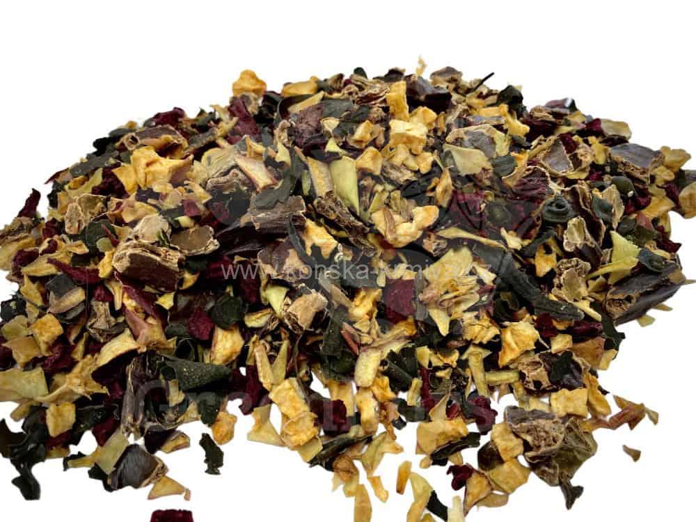 Vitamínová bomba vhodná pro doplnění minerálů, vitamínů, jako zdroj energie, zchutňovadlo a jako zpestření krmné dávky. Směs jablečných kostiček, červené řepy, chaluhy a karobu, zaručuje vyváženou chuť. Do směsi můžeme schovat další méně chutné doplňky, nebo léky.